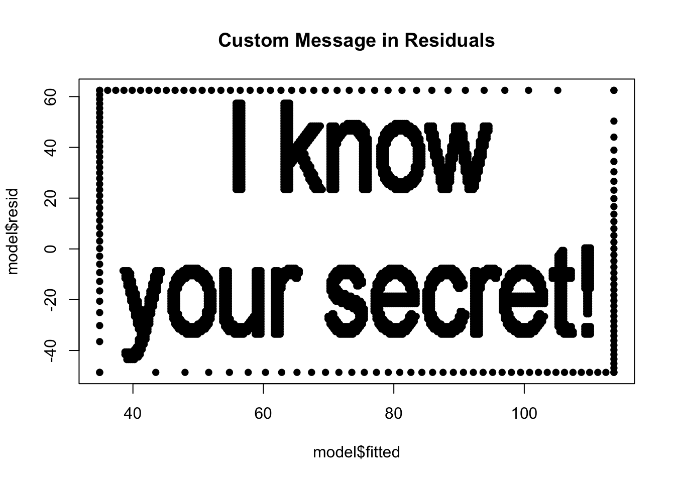 最近在统计之都发现了一个非常有趣的包surreal ,可以将信息转化为二维格点形式的图片,并进而加密藏进数据集,通过线性回归的残差图恢复出来。感觉很有意思,在此记录。